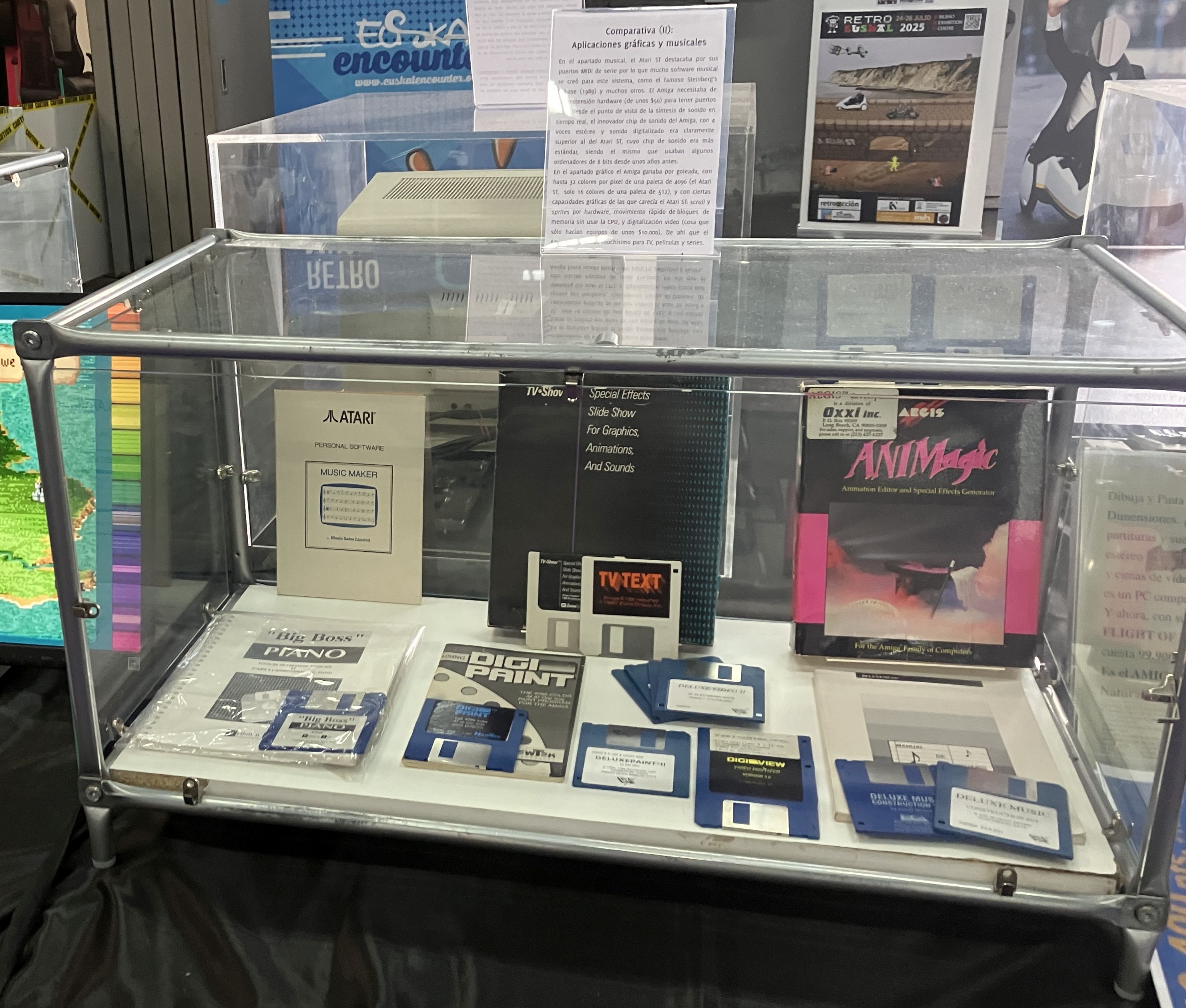 La segunda parte de la exposición presenta las dos familias de ordenadores personales que cumplen 40 años, los Atari ST y los Commodore Amiga, ambos clasificados como ordenadores domésticos de16 bits y con unas magníficas capacidades multimedia que les hicieron sobresalir por encima de cualquier alternativa anterior. Mostramos el Atari 520ST y el Commodore Amiga 1000, los primeros ordenadores de ambas familias. Y a continuación, un Atari 1040ST (1985) y un Commodore Amiga 500 (1987) encendidos para poder apreciar esas capacidades multimedia en acción. Por cierto que en ese Amiga 500 fue donde tuvo lugar el torneo del videojuego Worms (1995) de esta edición de RetroEuskal.