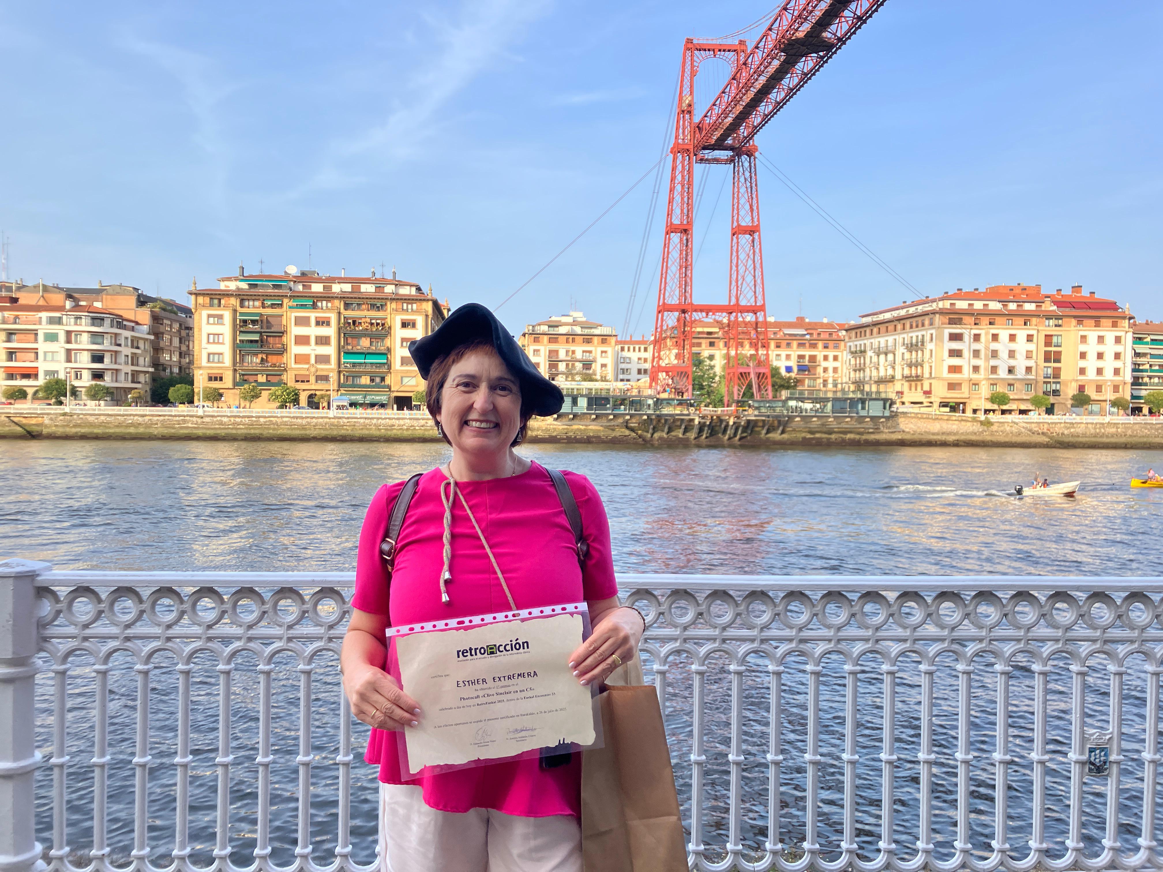 Y después de acabar el plazo para el envío de las fotos se procedió a sortear entre todos los participantes el lote de regalos que resultó ser para Esther Extremera, que, aunque no pudo pasarse por el stand de RetroEuskal a recoger sus regalos, sí se los pudimos hacer llegar y los recibió con muy buen humor, accediendo a posar con algunos de ellos en un marco incomparable: