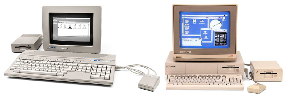 Las familias de ordenadores personales de 16 bits Atari ST y Commodore Amiga comenzaron su andadura en 1985, con sólo un mes de diferencia, cuando los ordenadores personales de 8 bits aún estaban en pleno apogeo, y poco a poco fueron ocupando su parte del mercado con los sucesivos miembros de cada familia. Y es que estas dos líneas de ordenadores no sólo superaban en potencia de microprocesador a sus predecesoras de 8 bits, sino que las superaban aún más en capacidades gráficas y sonoras, destacando comercialmente como equipos de edición multimedia tanto en el diseño de gráficos como en la industria musical.