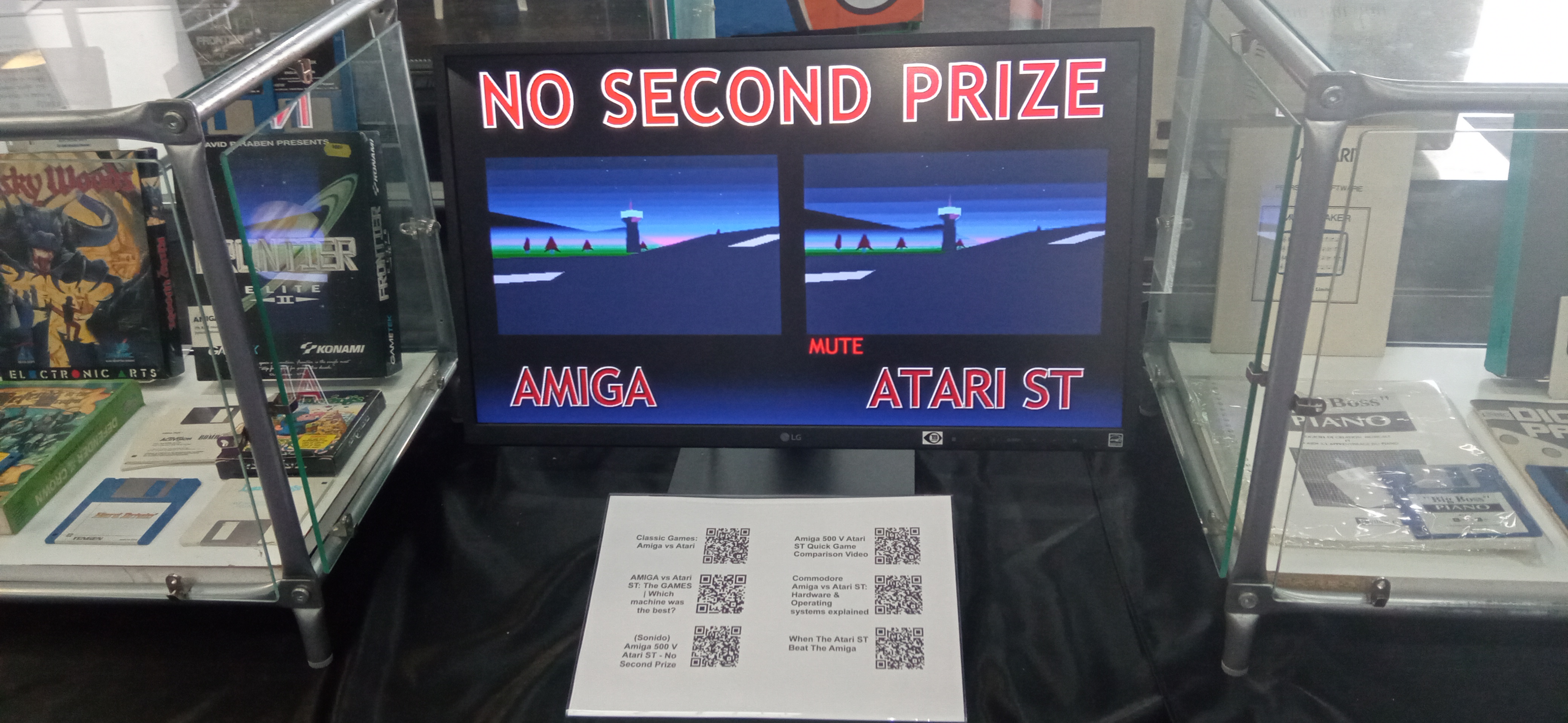 Una pantalla dedicada a la visualización de distintos videos permitía comparan ambos sistemas desde varios puntos de vista. Y para finalizar la exposición, una comparativa de ambas familias en el apartado de los videojuegos desarrollados para cada sistema, con una destacada victoria en este apartado de los Amiga, con notables títulos que se desarrollaron en dicho sistema, mientras que la mayoría de los juegos para Atari ST, aunque de calidad excelente, eran conversiones originalmente desarrolladas para otras máquinas.