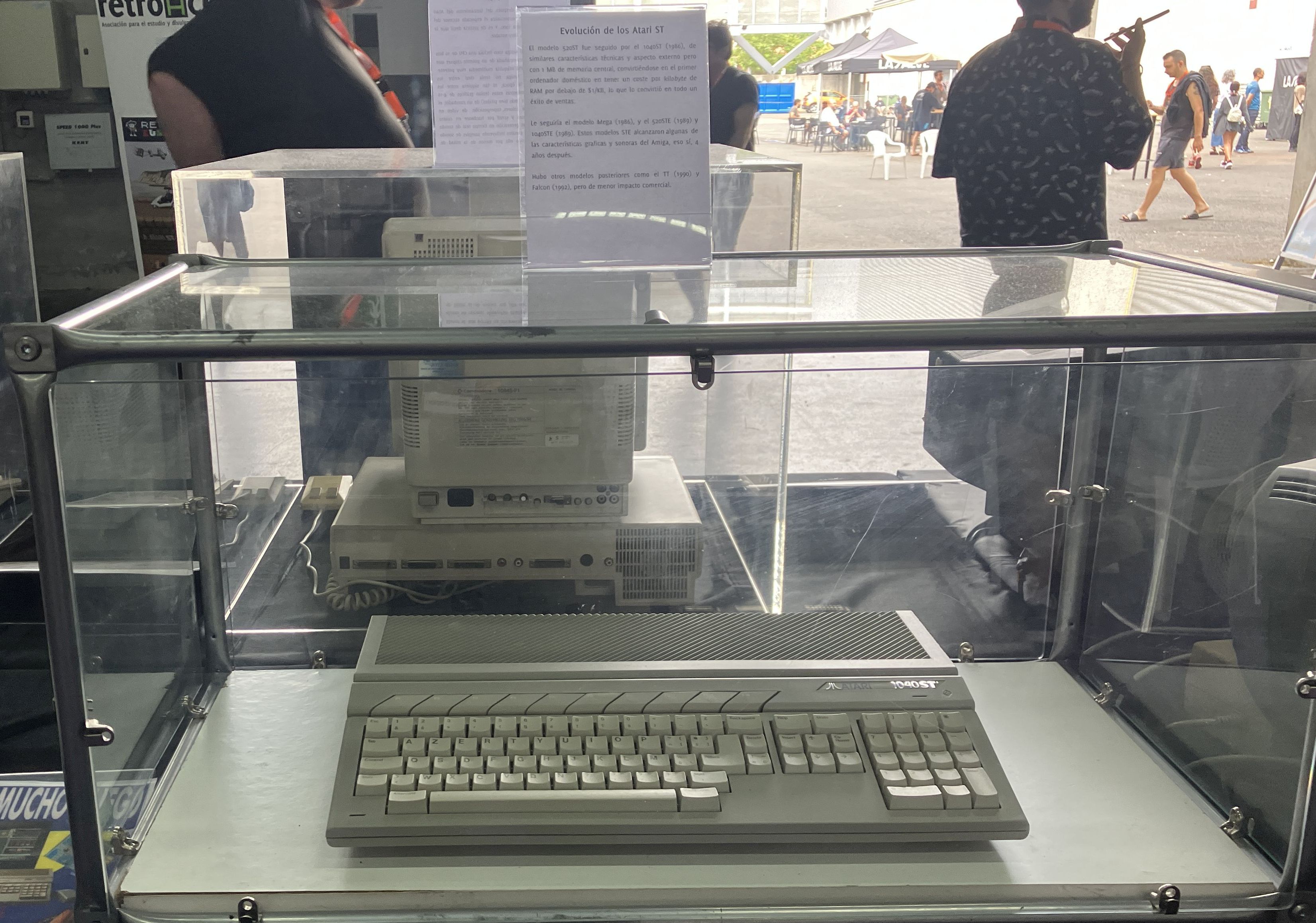 La segunda parte de la exposición presenta las dos familias de ordenadores personales que cumplen 40 años, los Atari ST y los Commodore Amiga, ambos clasificados como ordenadores domésticos de16 bits y con unas magníficas capacidades multimedia que les hicieron sobresalir por encima de cualquier alternativa anterior. Mostramos el Atari 520ST y el Commodore Amiga 1000, los primeros ordenadores de ambas familias. Y a continuación, un Atari 1040ST (1985) y un Commodore Amiga 500 (1987) encendidos para poder apreciar esas capacidades multimedia en acción. Por cierto que en ese Amiga 500 fue donde tuvo lugar el torneo del videojuego Worms (1995) de esta edición de RetroEuskal.